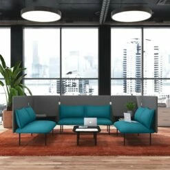 The QT Adaptable Lounge Collection stays flexible to your office needs—whether you need a comfy space to meet with a team or you want room to work solo. Featuring a soft, durable woven fabric, this simple, modular U-shaped sofa gives you a seating option that brings the coziness of working from home to the office space and breaks up the monotony of sitting at your desk so you can stay productive. Fluff up the pillows and get comfy: The back panel not only functions as a head rest, but also creates privacy while still feeling connected to the rest of the office. The two integrated double tiered coffee table gives you the ability to spread out, get organized, and (obviously) provide a safe place to rest your triple-shot latte during brainstorming sessions.
