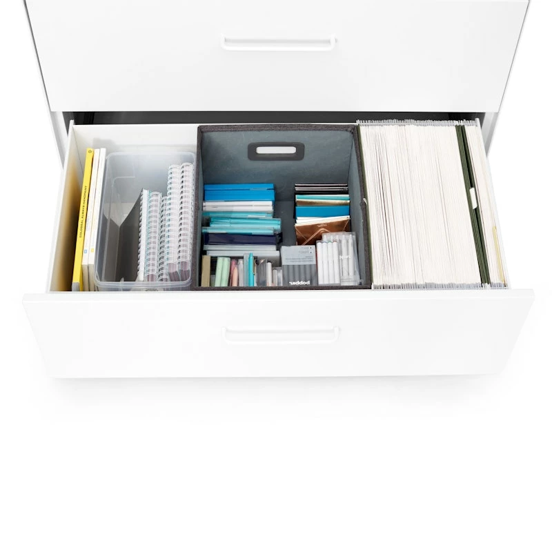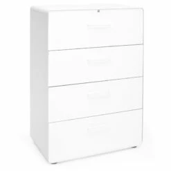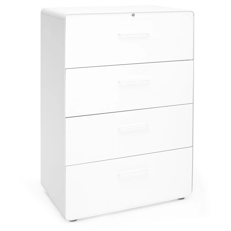 The 4-drawer format of our Lateral Stow File Cabinet was designed for those who need a lot of storage. Powder-coated steel construction with matching painted steel interior keeps documents and doodads super safe. One lock secures all drawers, giving the entire cabinet the privacy it deserves.